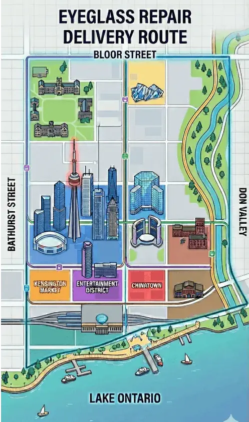 We proudly offer convenient pickup and delivery service in the Downtown Toronto Core (Bloor Street – Lake Ontario – Don Valley – Bathurst Street). Our team ensures quick, secure, and hassle-free transport for your eyewear repairs.
